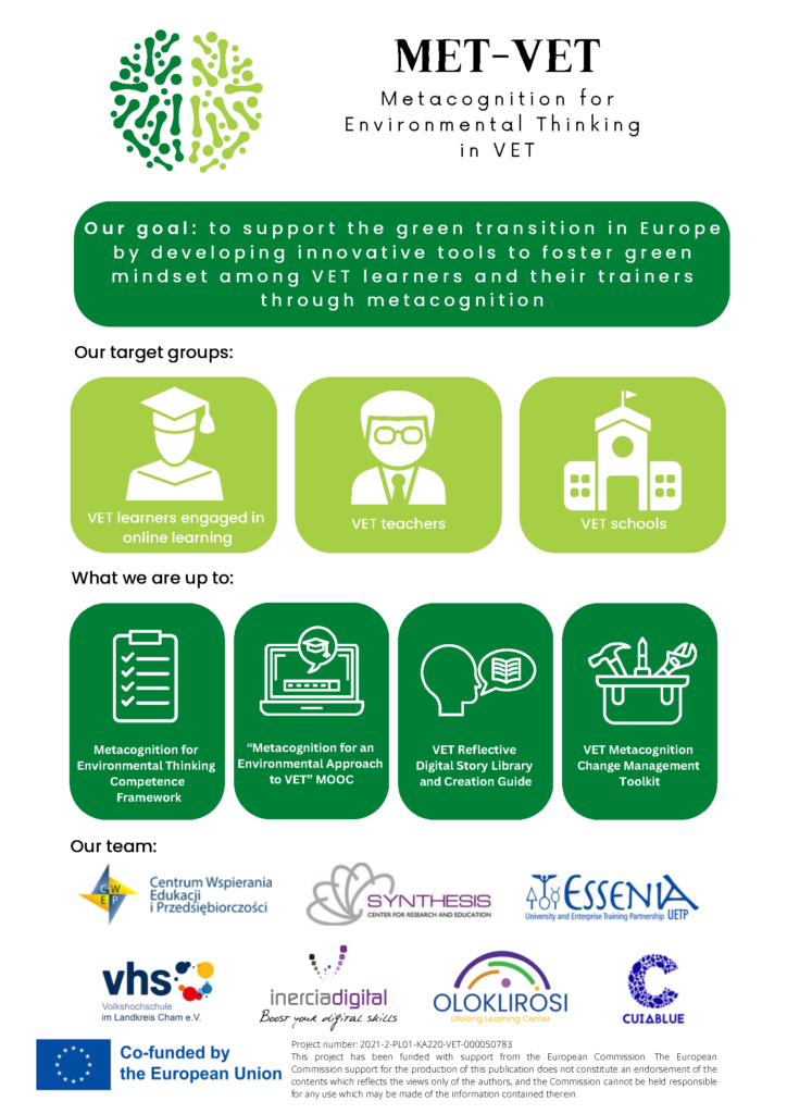 MET-VET is an Erasmus+ KA220-VET-73F8B619 project that aims to turn VET centres into advocates of the “greening process” by developing an innovative set of tools that support environmental awareness among VET learners and their educators through metacognition.